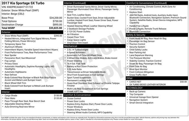 Hamden Chevrolet Mazda is proud to present you with another True Market Priced Pre-Owned Vehicle. Transparent Pricing Of $ 10500 !! This 2017 Kia Sportage SX is loaded with the following Factory Options: AWD AWD, 19 Alloy Wheels, 3-Step Heated & Ventilated Front Bucket Seats, 3.32 Axle Ratio, 4-Wheel Disc Brakes, 8 Speakers, ABS brakes, Air Conditioning, Alloy wheels, AM/FM radio: SiriusXM, Android Auto, Auto High-beam Headlights, Auto-dimming Rear-View mirror, Automatic temperature control, Brake assist, Bumpers: body-color, Cargo Cover, Cargo Net, Carpet Floor Mats, Delay-off headlights, Driver door bin, Driver vanity mirror, Dual front impact airbags, Dual front side impact airbags, Electronic Stability Control, Exterior Parking Camera Rear, Four wheel independent suspension, Front anti-roll bar, Front Bucket Seats, Front Center Armrest, Front dual zone A/C, Front fog lights, Front reading lights, Fully automatic headlights, Garage door transmitter: HomeLink, harman/kardon® Speakers, Heated door mirrors, Heated front seats, Heated steering wheel, High intensity discharge headlights: Bi-Xenon, Illuminated entry, Leather Seat Trim, Leather Shift Knob, Low tire pressure warning, Navigation System, Occupant sensing airbag, Outside temperature display, Overhead airbag, Overhead console, Panic alarm, Passenger door bin, Passenger vanity mirror, Power door mirrors, Power driver seat, Power Liftgate, Power moonroof, Power passenger seat, Power steering, Power windows, Radio: AM/FM/SiriusXM Stereo w/Navigation, Rear anti-roll bar, Rear seat center armrest, Rear window defroster, Rear window wiper, Remote keyless entry, Roof rack: rails only, Security system, Speed control, Speed-sensing steering, Split folding rear seat, Spoiler, Sport steering wheel, Steering wheel mounted audio controls, SX Turbo Beige Leather Interior, Tachometer, Telescoping steering wheel, Tilt steering wheel, Traction control, Trip computer, Turn signal indicator mirrors, Variably intermittent wipers, and Ventilated front seats!!