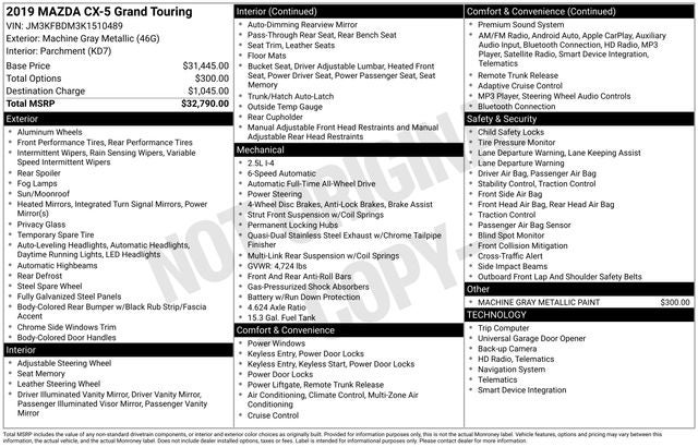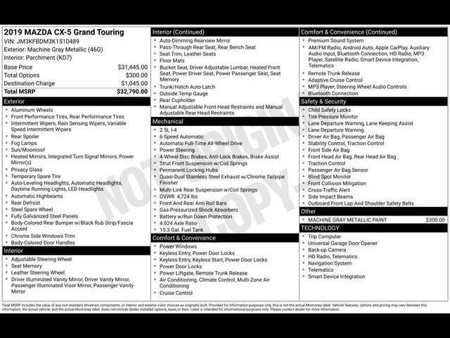 Hamden Chevrolet Mazda is proud to present you with another True Market Priced Pre-Owned Vehicle. Transparent Pricing Of $ 16888 !! This 2019 Mazda CX-5 Grand Touring is loaded with the following Factory Options: 10 Speakers, 4-Wheel Disc Brakes, 4.624 Axle Ratio, ABS brakes, Air Conditioning, Alloy wheels, AM/FM radio: SiriusXM, AppLink/Apple CarPlay and Android Auto, Auto High-beam Headlights, Auto-dimming Rear-View mirror, Automatic temperature control, Bose 10-Speaker Audio Sound System, Brake assist, Bumpers: body-color, Delay-off headlights, Driver door bin, Driver vanity mirror, Dual front impact airbags, Dual front side impact airbags, Electronic Stability Control, Emergency communication system, Exterior Parking Camera Rear, Four wheel independent suspension, Front anti-roll bar, Front Bucket Seats, Front Center Armrest, Front dual zone A/C, Front fog lights, Front reading lights, Fully automatic headlights, Garage door transmitter: HomeLink, Heated door mirrors, Heated front seats, Heated Front Sport Seats, Illuminated entry, Leather Seat Trim, Leather Shift Knob, Low tire pressure warning, Machine Gray Metallic Paint, Mazda Navigation System, Memory seat, Navigation system: MAZDA CONNECT, Occupant sensing airbag, Outside temperature display, Overhead airbag, Overhead console, Panic alarm, Passenger door bin, Passenger vanity mirror, Power door mirrors, Power driver seat, Power Liftgate, Power moonroof, Power passenger seat, Power steering, Power windows, Radio data system, Radio: AM/FM/HD Audio System, Rain sensing wipers, Rear anti-roll bar, Rear reading lights, Rear seat center armrest, Rear window defroster, Rear window wiper, Remote keyless entry, Speed control, Speed-sensing steering, Split folding rear seat, Spoiler, Steering wheel mounted audio controls, Tachometer, Telescoping steering wheel, Tilt steering wheel, Traction control, Trip computer, Turn signal indicator mirrors, Variably intermittent wipers, and Wheels: 19 x 7J Aluminum Alloy w/Silver Finish!!