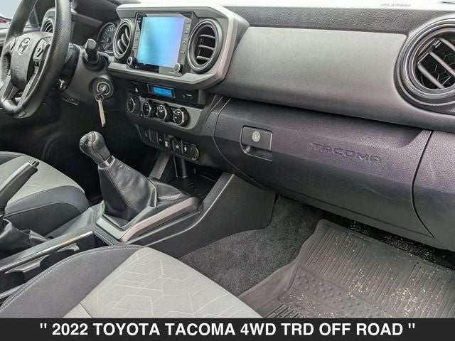 Hamden Chevrolet Mazda is proud to present you with another True Market Priced Pre-Owned Vehicle. Transparent Pricing Of $ 32000 !! This 2022 Toyota Tacoma TRD Off-Road V6 is loaded with the following Factory Options: 4WD, ABS brakes, Alloy wheels, Electronic Stability Control, Front dual zone A/C, Heated door mirrors, Illuminated entry, Low tire pressure warning, Remote keyless entry, and Traction control 4WD, ABS brakes, Alloy wheels, Electronic Stability Control, Front dual zone A/C, Heated door mirrors, Illuminated entry, Low tire pressure warning, Remote keyless entry, Traction control, 120V/400W Deck Mounted AC Power, 6 Speakers, Air Conditioning, AM/FM radio: SiriusXM, Anti-whiplash front head restraints, Apple CarPlay/Android Auto, Auto High-beam Headlights, Auto-dimming Rear-View mirror, Auto-Dimming Rearview Mirror w/HomeLink, Automatic temperature control, Black Overfenders, Brake assist, Bumpers: body-color, Driver door bin, Dual front impact airbags, Dual front side impact airbags, Emergency communication system: Safety Connect with 1-year trial, Engine Immobilizer, Exterior Parking Camera Rear, Fabric Seat Trim (FD), Front anti-roll bar, Front Bucket Seats, Front Center Armrest, Front fog lights, Front reading lights, Front Seats, Front wheel independent suspension, Garage door transmitter: HomeLink, Knee airbag, Leather Shift Knob, Occupant sensing airbag, Outside temperature display, Overhead airbag, Overhead console, Panic alarm, Passenger door bin, Power door mirrors, Power driver seat, Power Sliding Rear Window w/Privacy Glass, Power steering, Power windows, Radio: AM/FM Radio, Rear step bumper, Security system, Speed control, Speed-sensing steering, Split folding rear seat, Steering wheel mounted audio controls, Tachometer, Telescoping steering wheel, Tilt steering wheel, Trip computer, Turn signal indicator mirrors, Variably intermittent wipers, and Wheels: 16 x 7J Machined Contrast Alloy!!