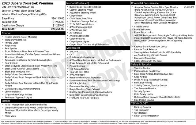 Hamden Chevrolet Mazda is proud to present you with another True Market Priced Pre-Owned Vehicle. Transparent Pricing Of $ 22400 !! This 2023 Subaru Crosstrek Premium is loaded with the following Factory Options: Moonroof & BSD w/RCTA & Power Driver Seat (6-Way Power Driver's Seat, Blind Spot Detection w/Rear Cross-Traffic Alert, EyeSight System, Keyless Access w/Push-Button Start, and Power Moonroof) Moonroof & BSD w/RCTA & Power Driver Seat (6-Way Power Driver's Seat, Blind Spot Detection w/Rear Cross-Traffic Alert, EyeSight System, Keyless Access w/Push-Button Start, and Power Moonroof), 3.90 Axle Ratio, 4-Wheel Disc Brakes, 6 Speakers, ABS brakes, Air Conditioning, Alloy wheels, AM/FM radio: SiriusXM, Anti-whiplash front head restraints, Automatic temperature control, Brake assist, Bumpers: body-color, CD player, Cloth Upholstery, Driver door bin, Driver vanity mirror, Dual front impact airbags, Dual front side impact airbags, Electronic Stability Control, Emergency communication system: STARLINK Safety and Security (Subscription Required), Exterior Parking Camera Rear, Four wheel independent suspension, Front anti-roll bar, Front Bucket Seats, Front Center Armrest, Front fog lights, Front reading lights, Fully automatic headlights, Heated door mirrors, Heated Front Bucket Seats, Heated front seats, Illuminated entry, Knee airbag, Leather Shift Knob, Low tire pressure warning, Occupant sensing airbag, Outside temperature display, Overhead airbag, Overhead console, Panic alarm, Passenger door bin, Passenger vanity mirror, Power door mirrors, Power steering, Power windows, Radio data system, Radio: Subaru STARLINK 6.5 Multimedia Plus System, Rear anti-roll bar, Rear window defroster, Rear window wiper, Remote keyless entry, Security system, Speed control, Speed-sensing steering, Split folding rear seat, Spoiler, STARLINK/Apple CarPlay/Android Auto, Steering wheel mounted audio controls, Tachometer, Telescoping steering wheel, Tilt steering wheel, Traction control, Trip computer, Variably intermittent wipers, and Wheels: 17 x 7.0J Alum Alloy Blk w/Machine Finish!!